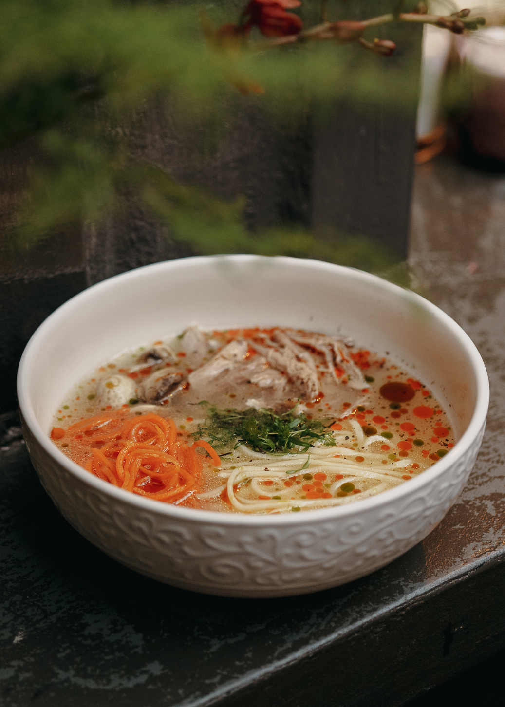 Кальмар, фаршированный красной рыбой и грибами, с лапшой из моркови