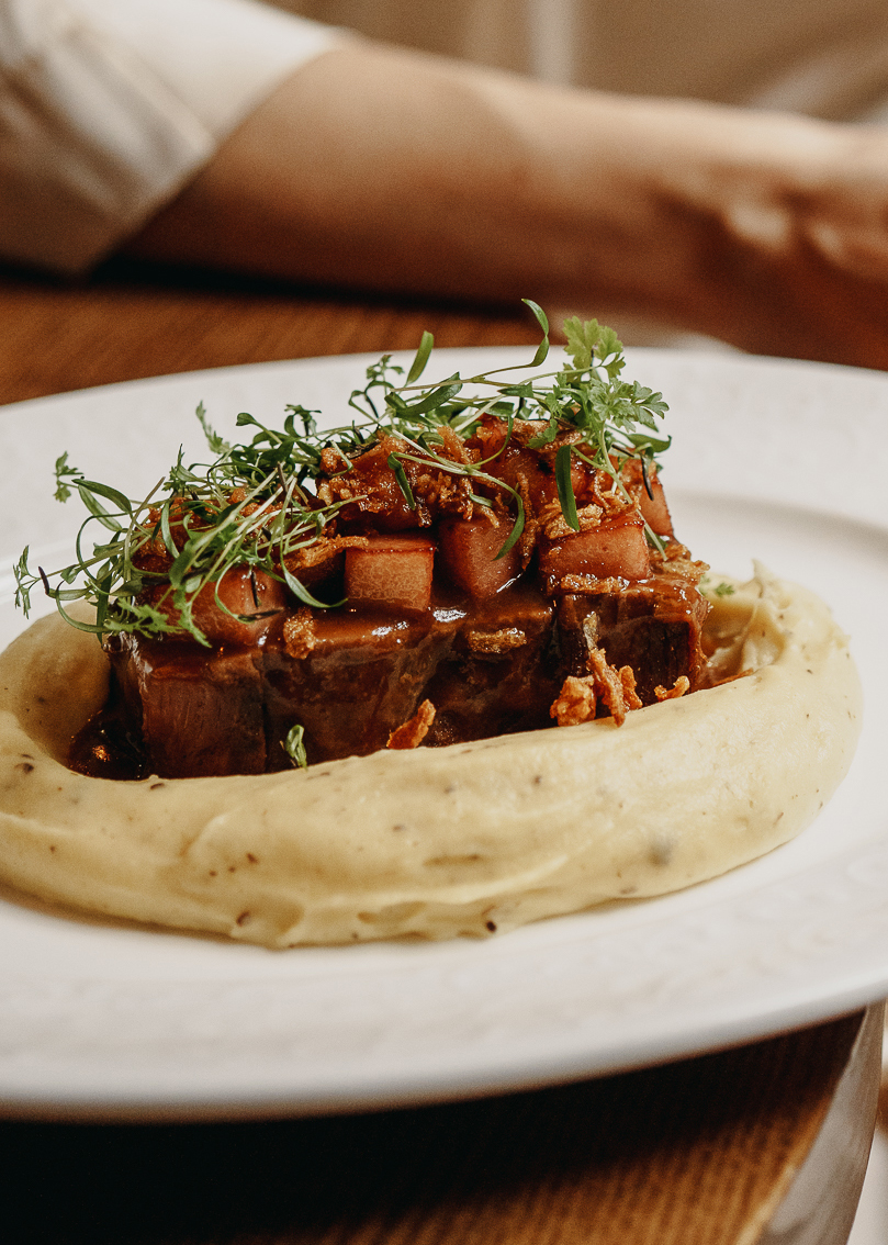 Томленая говяжья грудинка с соусом "Демиглас" и пюре с трюфелем