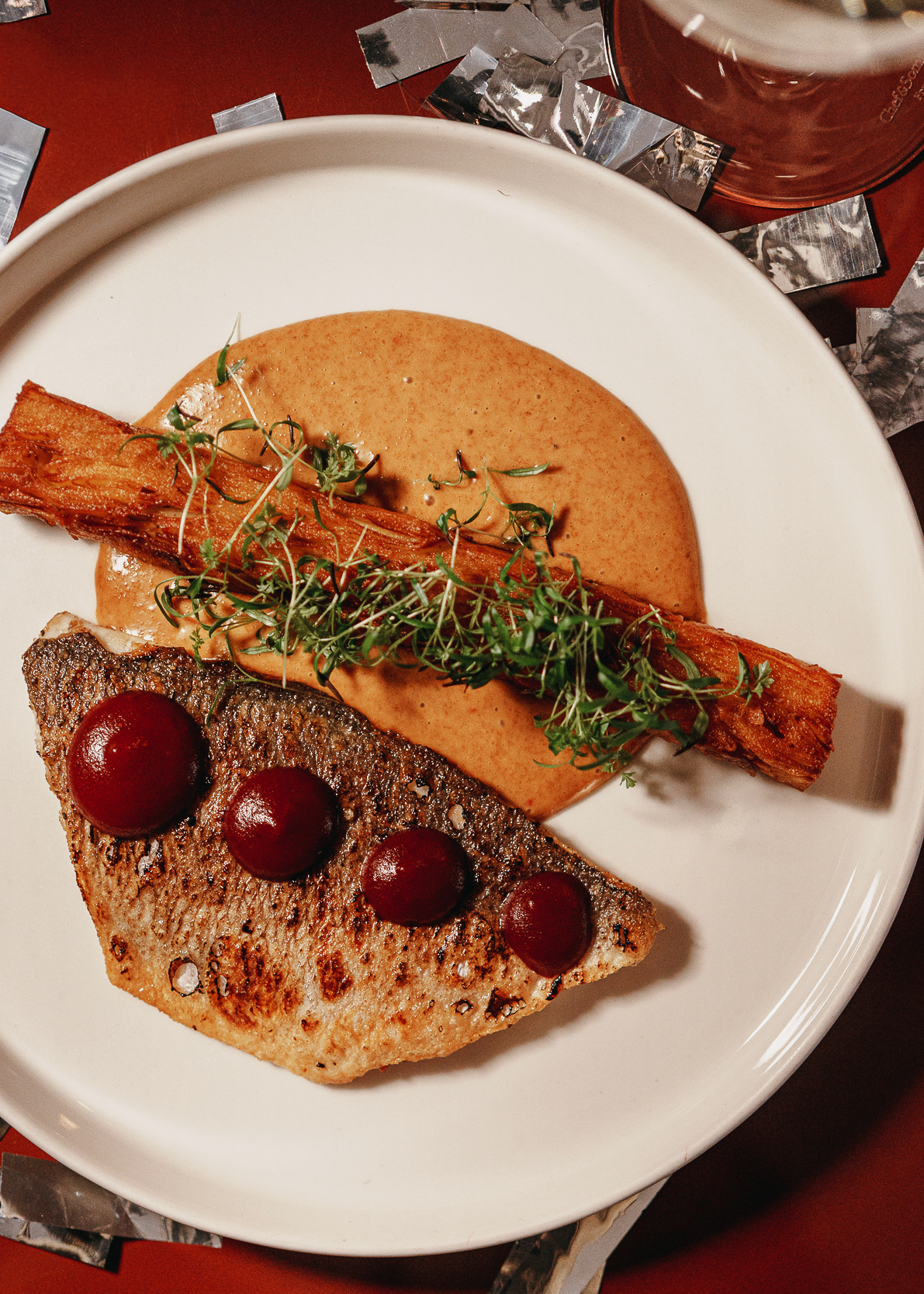 Филе дорадо с картофельным гратеном и соусом банановый чили