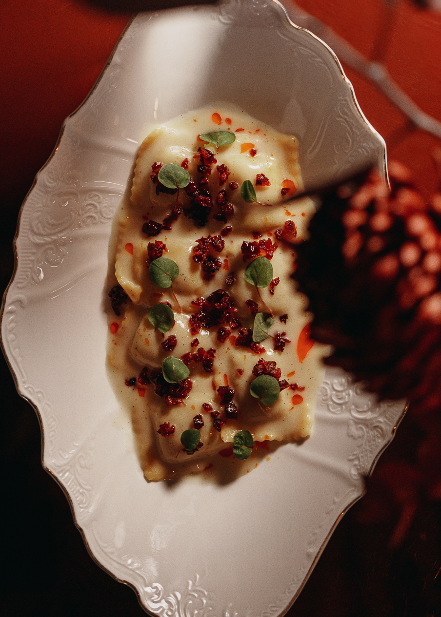 Равиоли с рикоттой, шпинатом и лимонным соусом берблан